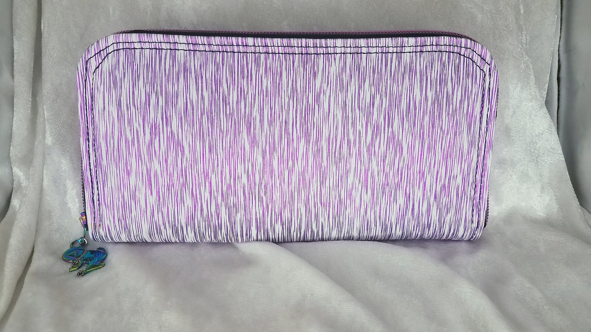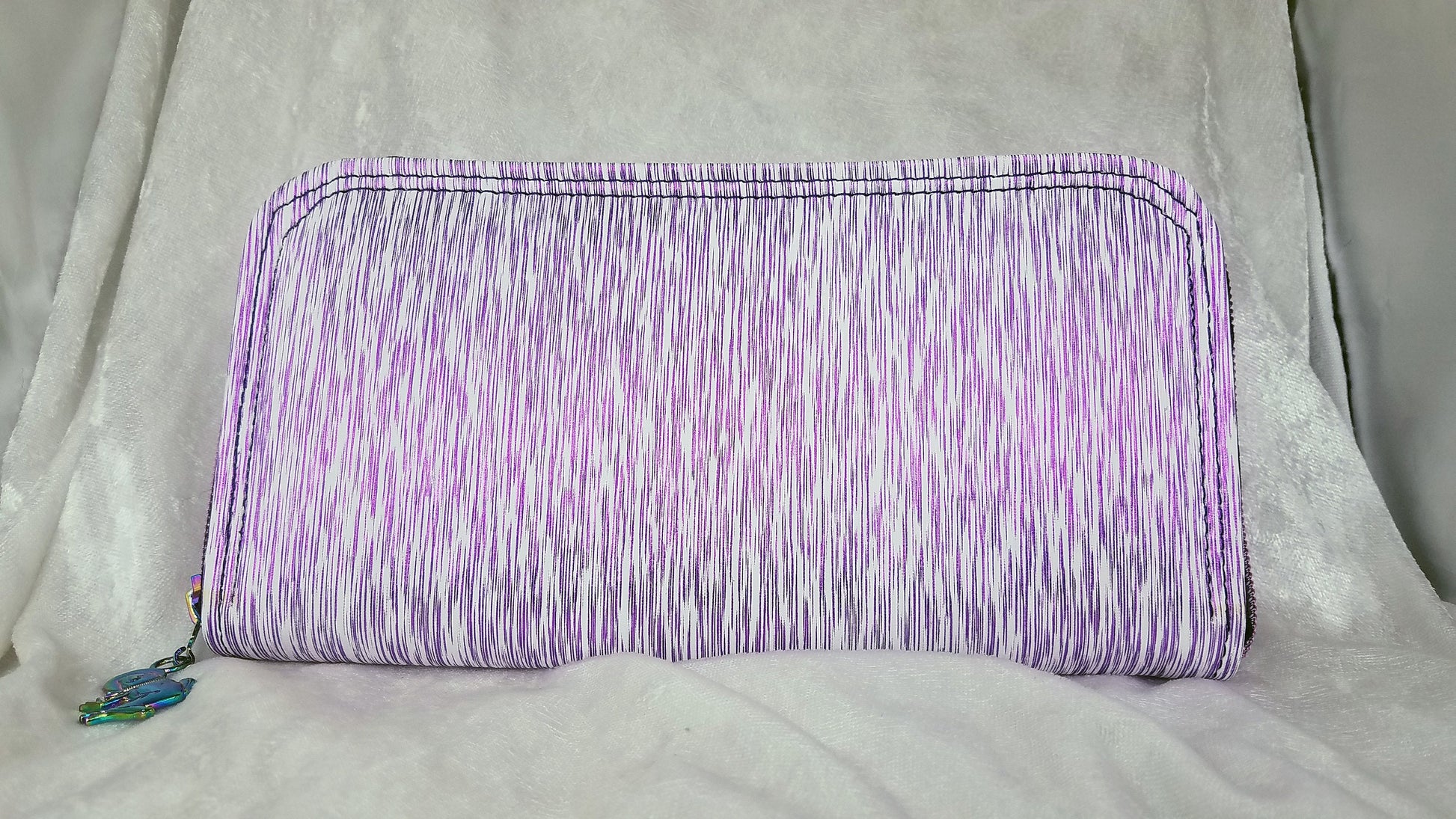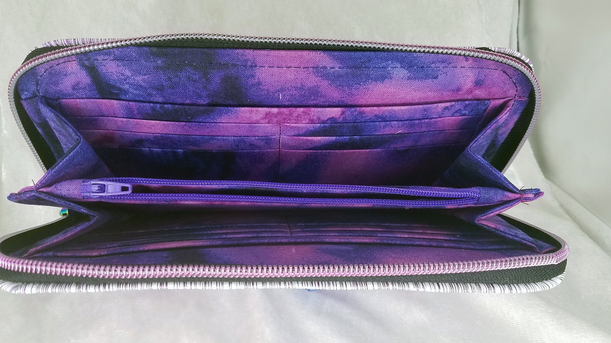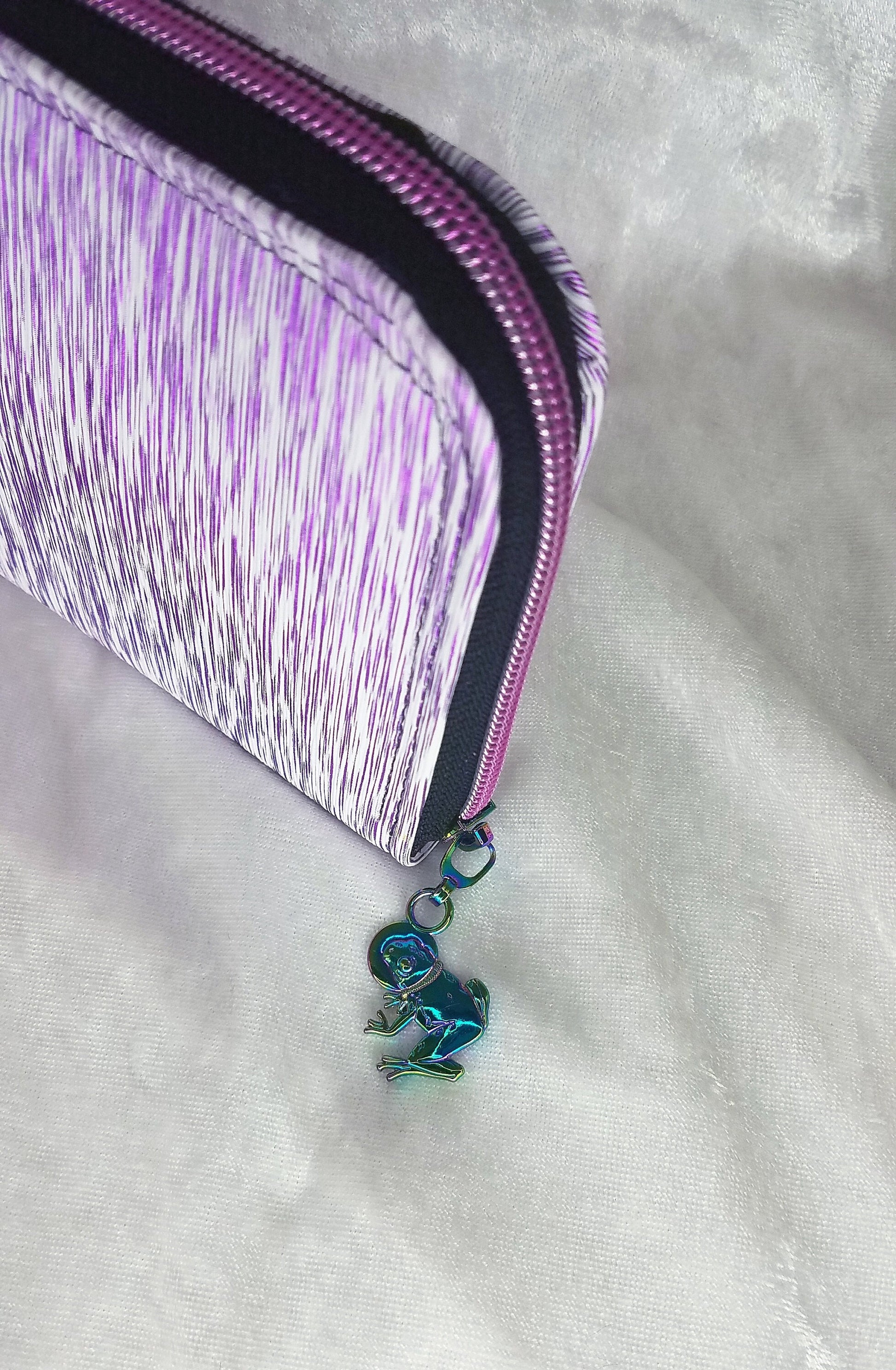 Listing is for purple tie dye space frog zip around wallet. The zipper pull is a double-sided space frog pull in Iridescent Rainbow.