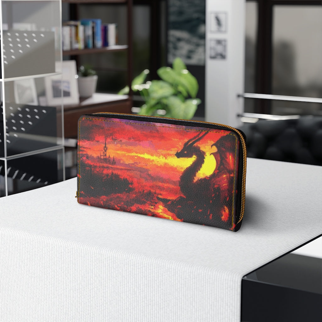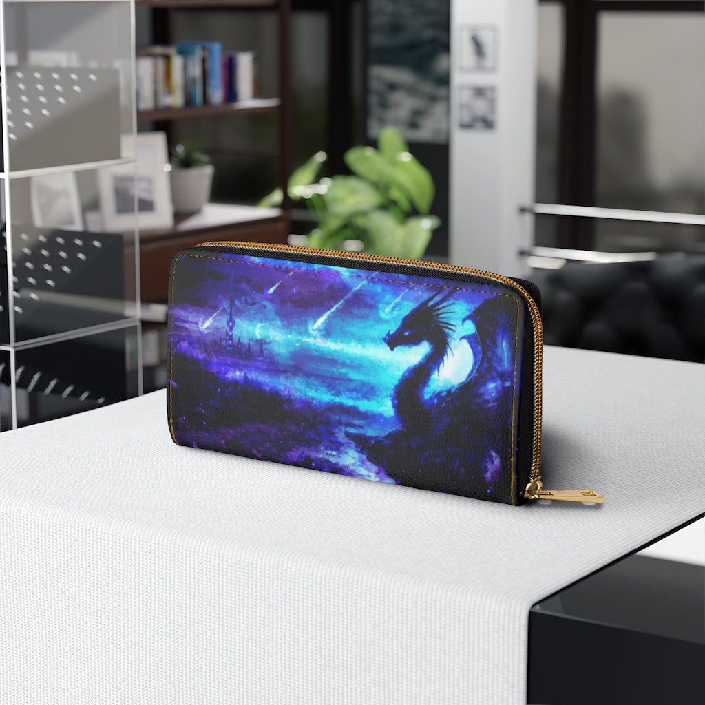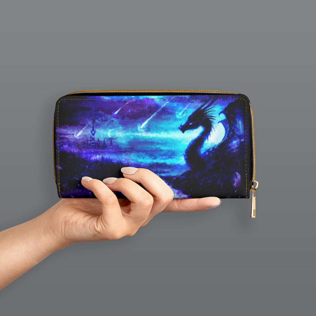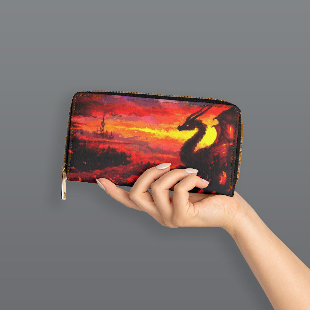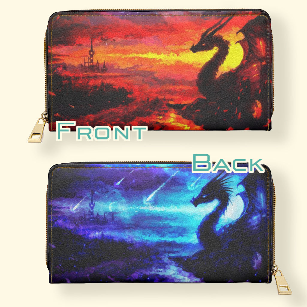 This wallet features a dragon watching a city. Red dragon on one side and a blue dragon on the other. This wallet will become something you love and others will as well. It is perfect for carrying around all your credit cards, cash, and driver's license. It is unique and eye-catching.